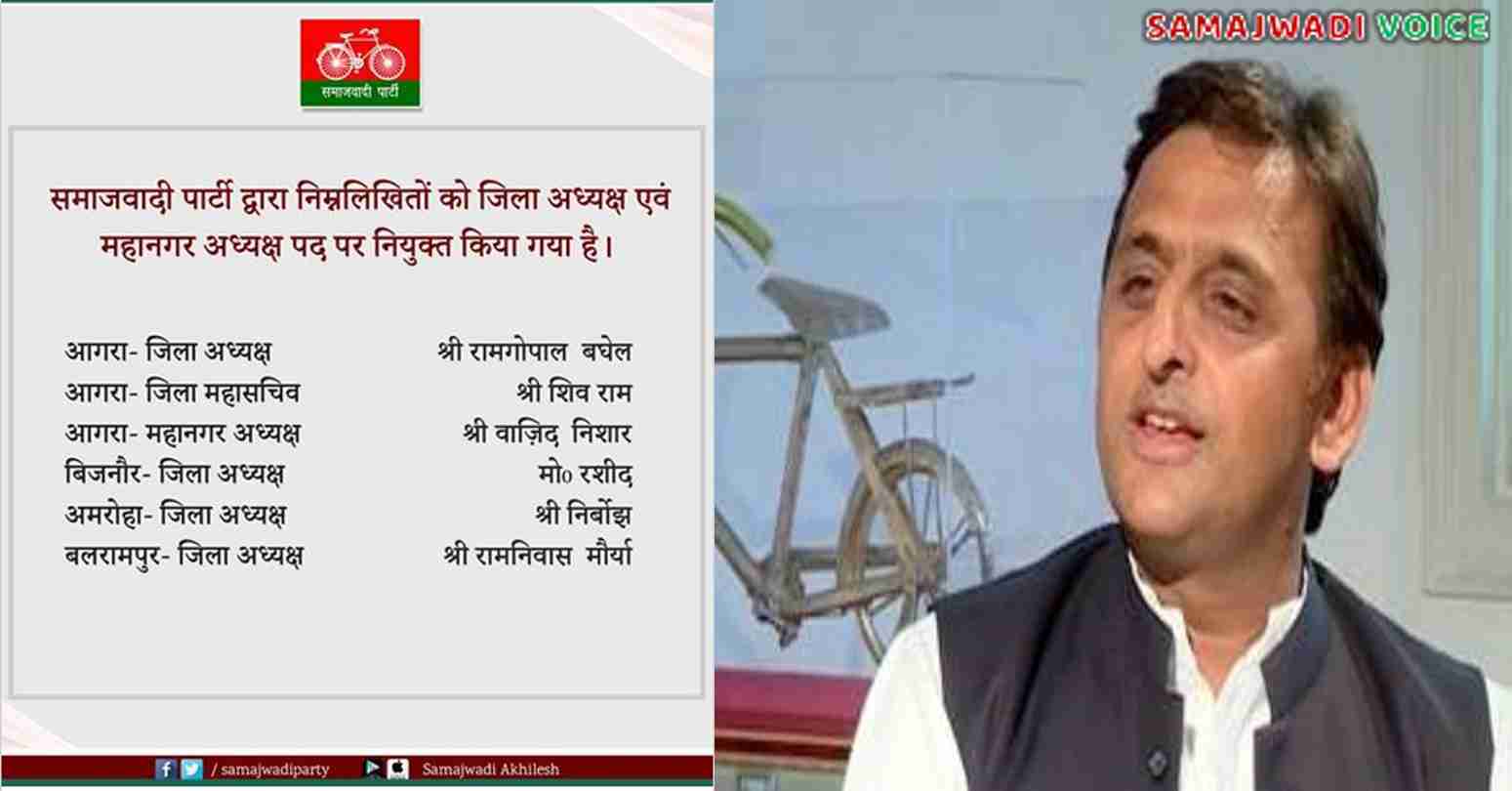 गुरुवार को सपा प्रमुख ने आगरा ,अमरोहा ,विजनौर बलरामपुर के जिला अध्यक्षों की सूची जारी कर दी हैं।