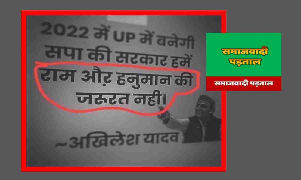 सोशल मीडिया पर सपा प्रमुख अखिलेश यादव को बदनाम करने की साजिस लगातार उनके विरोधी करते रहते हैं आज कल सोशल मिडिया पर अखिलेश यादव के नाम से एक बयान वायरल हो रहा है। बयान में कहा गया है कि हमें राम और हनुमान की जरूरत नहीं है और उत्तर प्रदेश में 2022 में समाजवादी पार्टी की सरकार बनेगी।