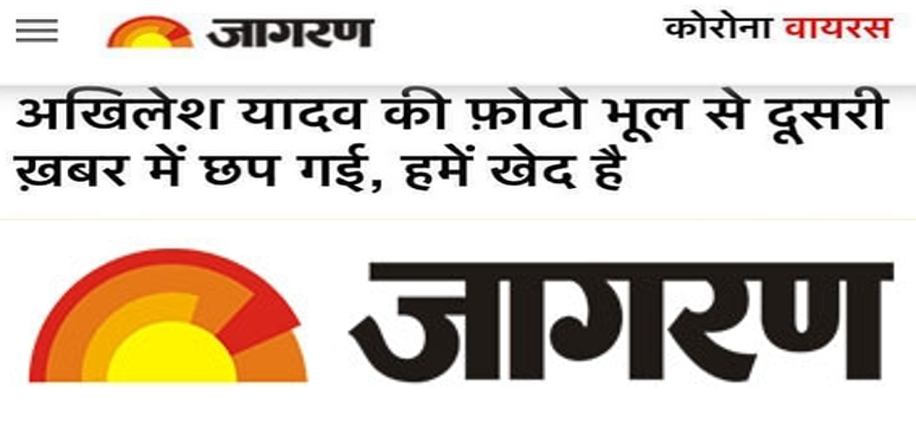 दैनिक जागरण ने 24 अप्रैल 2020 के गोरखपुर संस्करण में पेज -9 पर अखिलेश यादव कीगलत खबर के साथ फोटो छाप दी थी। जिसका शीर्षक था...