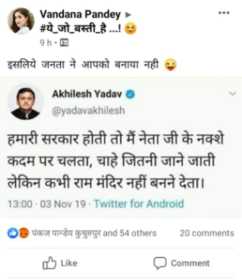 फेसबुक यूजर “प्रशान्त मणि त्रिपाठी’ ने अखिलेश यादव के नाम से किए गए कथित ट्वीट के स्क्रीन शॉट को शेयर किया है। इसमें लिखा हुआ है, ”हमारी सरकार होती तो मैं नेता जी के नक्शे कदम पर चलता, चाहे जितनी जाने जाती लेकिन राम मंदिर कभी नहीं बनने देता।”