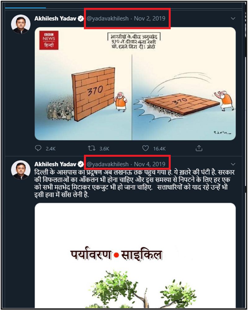 वायरल पोस्ट में अखिलेश यादव के वेरिफाइड ट्विटर हैंडल से किए गए कथित ट्वीट की तस्वीर लगी है, जिसमें 3 नवंबर 2019 की तारीख का जिक्र है।