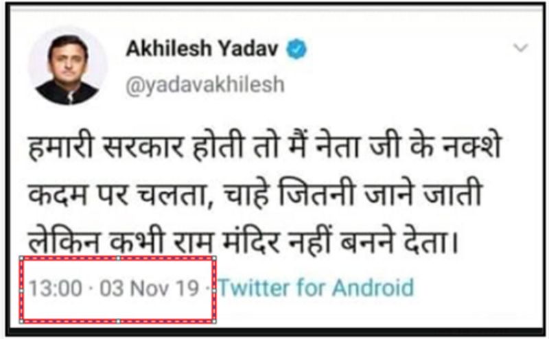 यानी अखिलेश यादव के नाम से राम मंदिर को लेकर जिस ट्वीट का स्क्रीनशॉट वायरल हो रहा है,