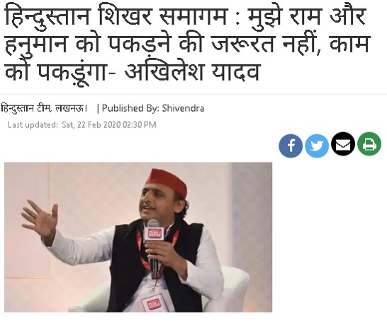 हिन्दुस्तान शिखर समागम का वीडियो हमे यूट्यूब पर मिला जिसमें अखिलेश यादव से पूछा गया कि (केजरीवाल ने हनुमान को पकड़ लिया, बीजेपी ने राम को पकड़ लिया…..तो आप कृष्ण जी को पकड़ लीजिए…यदुवंशी हैं आप) का जवाब देते हुए अखिलेश यादव ने कहा, ‘ सैफई में हमारा जन्म हुआ है और मैंने बुजुर्गों को देखा है कि पहले वह धरती को छूते थे और राम-राम कहकर बुलाते थे। हम काम को पकड़े हैं…एक्सप्रेस-वे बना रहे हैं…ऐसा एक्सप्रेस-वे बनाया है कि उस पर हरक्यूलिस उतार सकते हैं।’